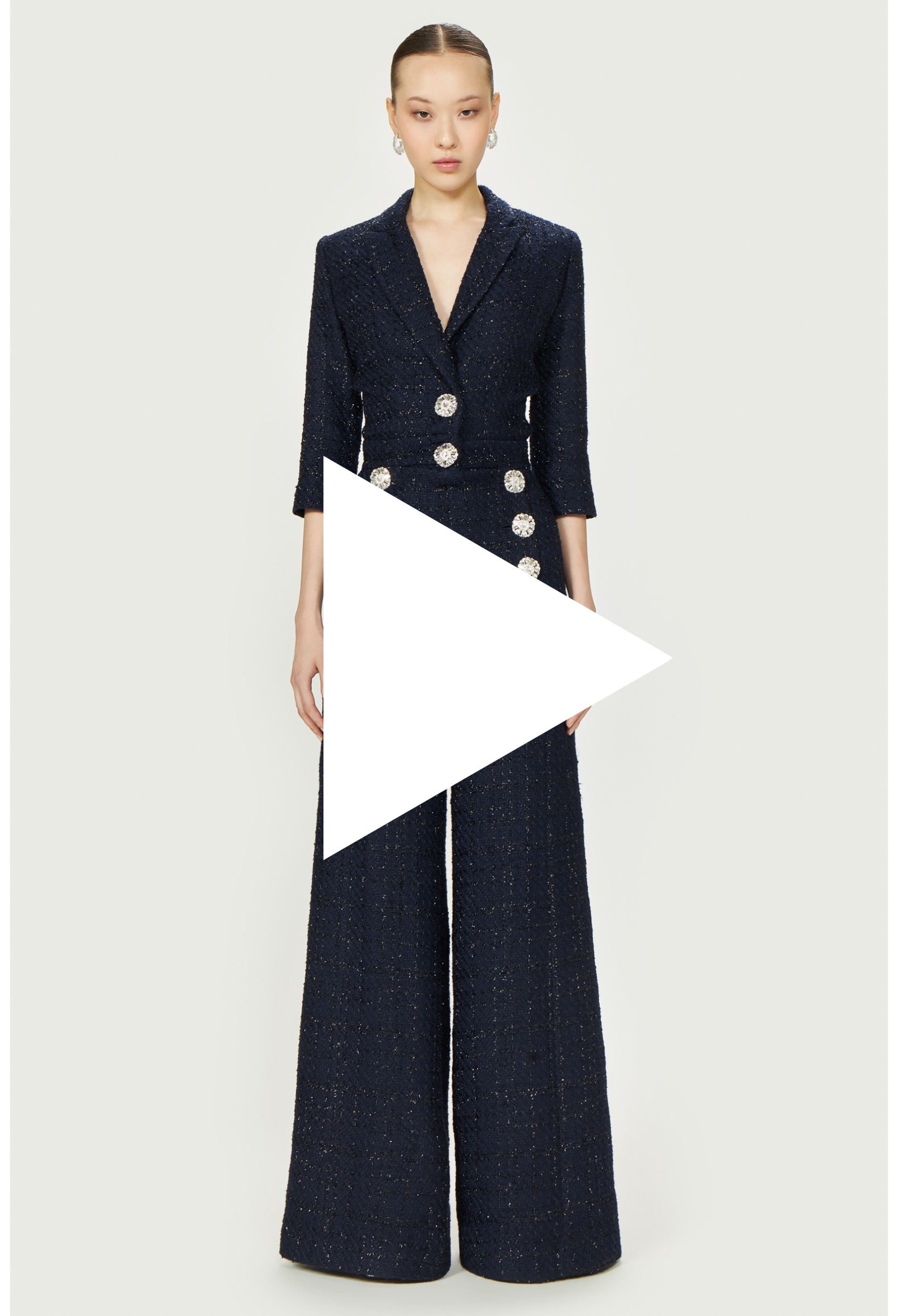 Make a statement in the Emilia lurex tweed jumpsuit, tailored with a sleek silhouette and accented by sparkling crystal buttons. Both polished and playful, it’s a standout piece for any occasion.