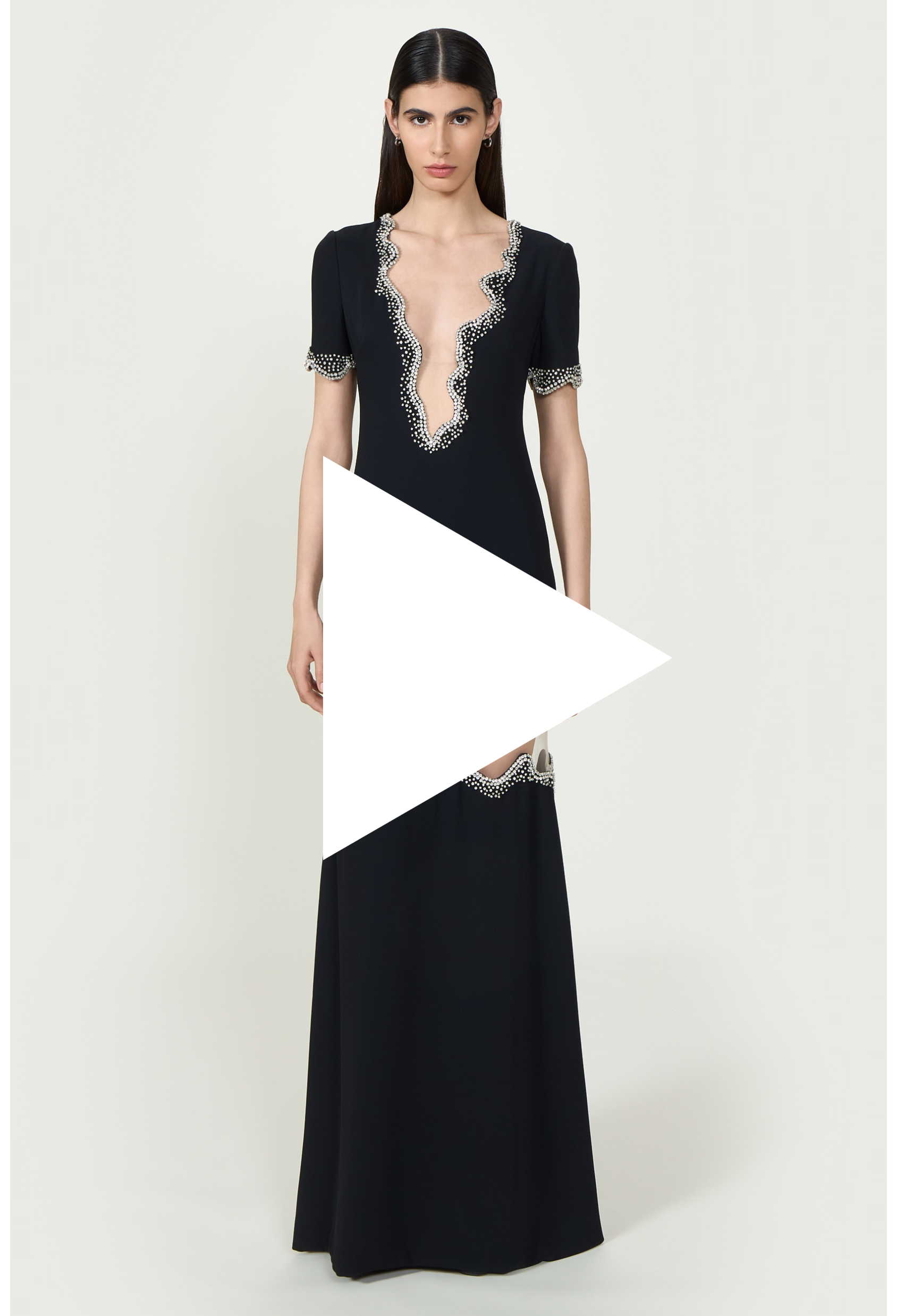 The Amira features a sculpted silhouette with a deep wave-cut neckline outlined in shimmering crystals. Contrasting sheer inserts and cascading wave-trim details create a bold interplay of structure and movement.