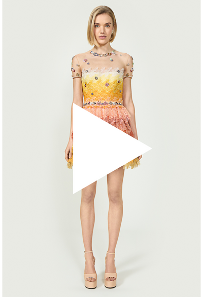 The Orielle dress enchants in gossamer lace, adorned with delicate embellishments and a soft ombré gradient that glows with warmth. A tiered mini silhouette adds playful movement, blending couture detail with effortless femininity.