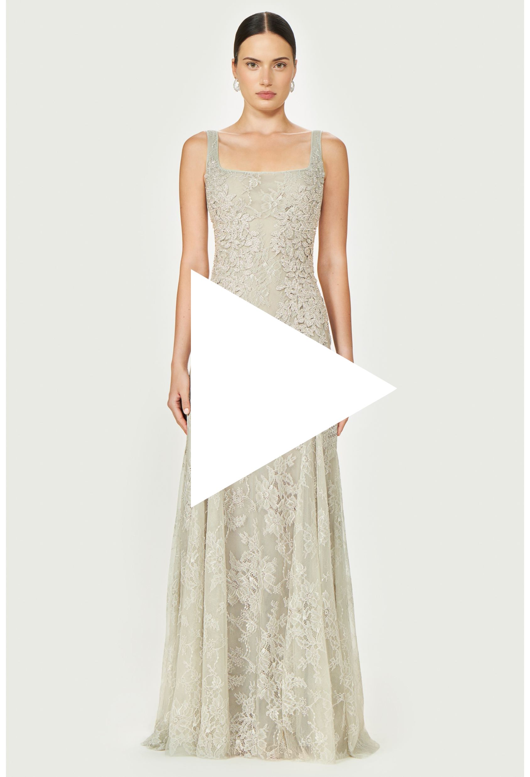 Refined elegance meets modern romance in the Elysia lace square-neck gown. In a flattering silhouette and adorned with shimmering beaded appliqué, it is the ideal choice for evening soirées.