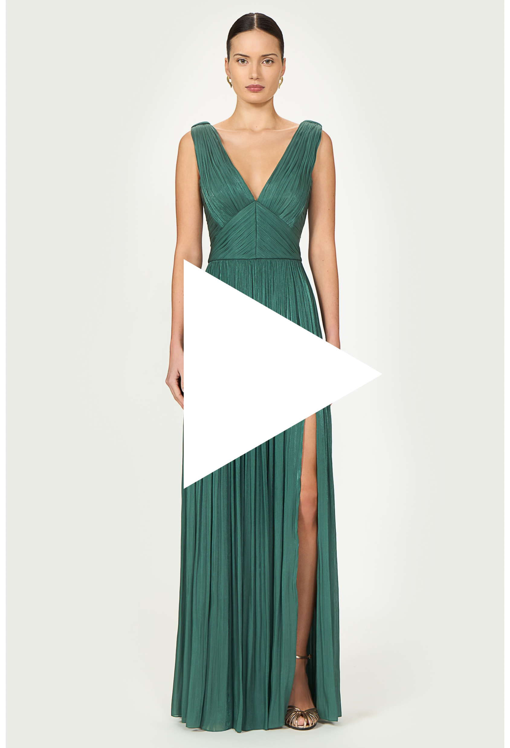 The Anilia gown is defined by fluid pleating and a deep V neckline that elongates the frame. A subtle lurex sheen and thigh-high slit add a contemporary edge to the refined silhouette.