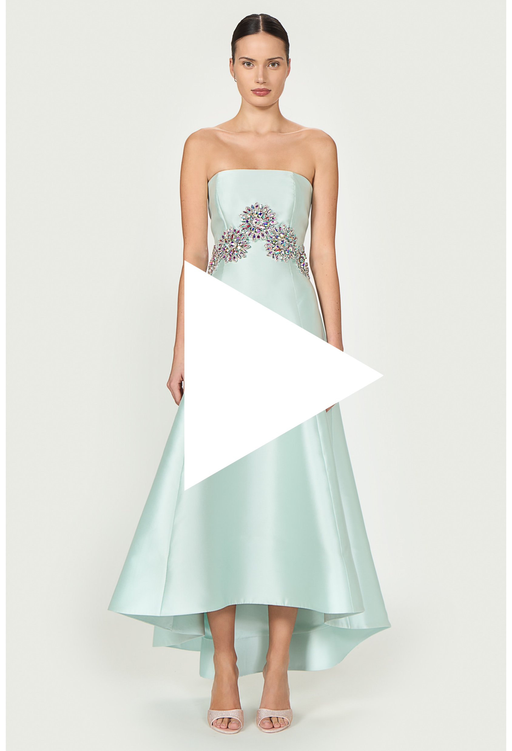 A luxurious silk-blend Mikado strapless gown, featuring princess seams that sculpt the silhouette, sparkling crystal embellishments along the waist and a dramatic high-low hem.