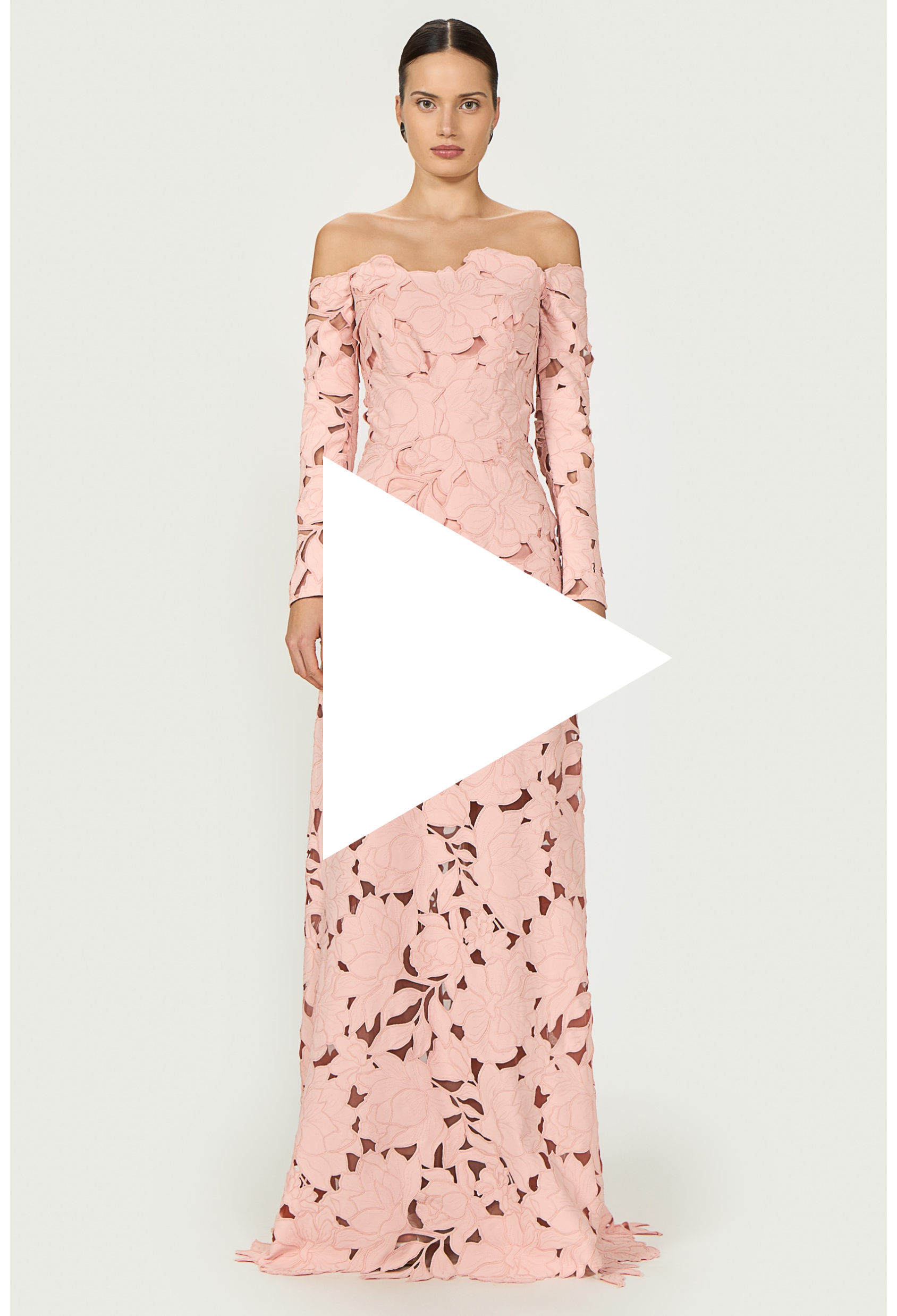 A mesmerizing off-shoulder gown crafted from floral-cut corded lace. This design features exquisite scalloped edges, a dramatic cutout back, and refined ribbon and bow accents.
