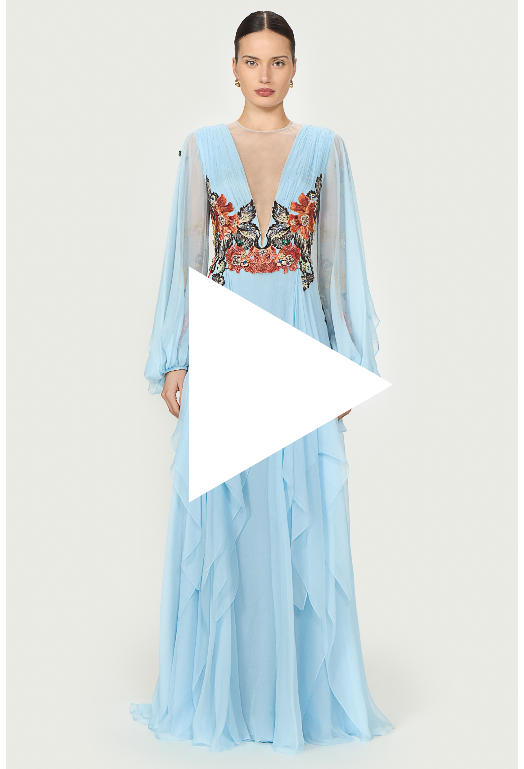 The Teya gown is crafted in crinkle silk chiffon, flowing effortlessly with refined elegance.