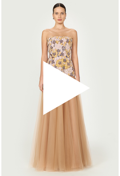 Featuring an airy tulle skirt and delicately adorned with intricate floral embroidery and shimmering beadwork on the bodice, this enchanting piece exudes timeless appeal.