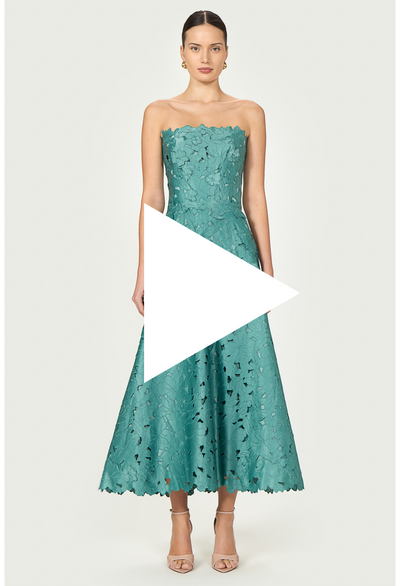 Radiate confidence in the Vella A-line dress. Featuring a strapless silhouette and intricate heat-cut lace details, it’s the perfect blend of boldness and elegance.