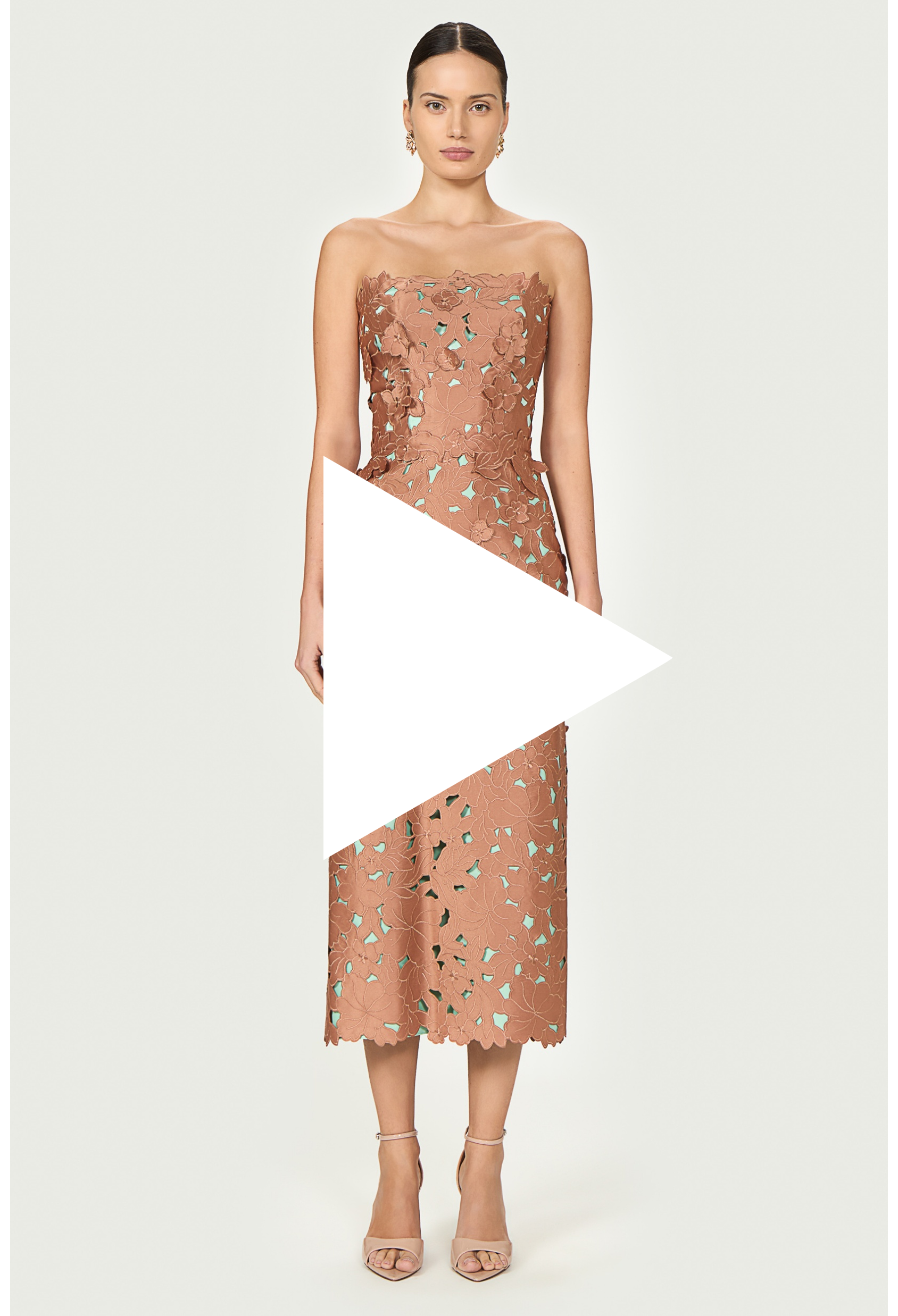 In a flawless strapless design and contrasting lining that peaks throught its intricate heat-cut lace detailing, this dress effortlessly combines modern sophistication with classic charm.