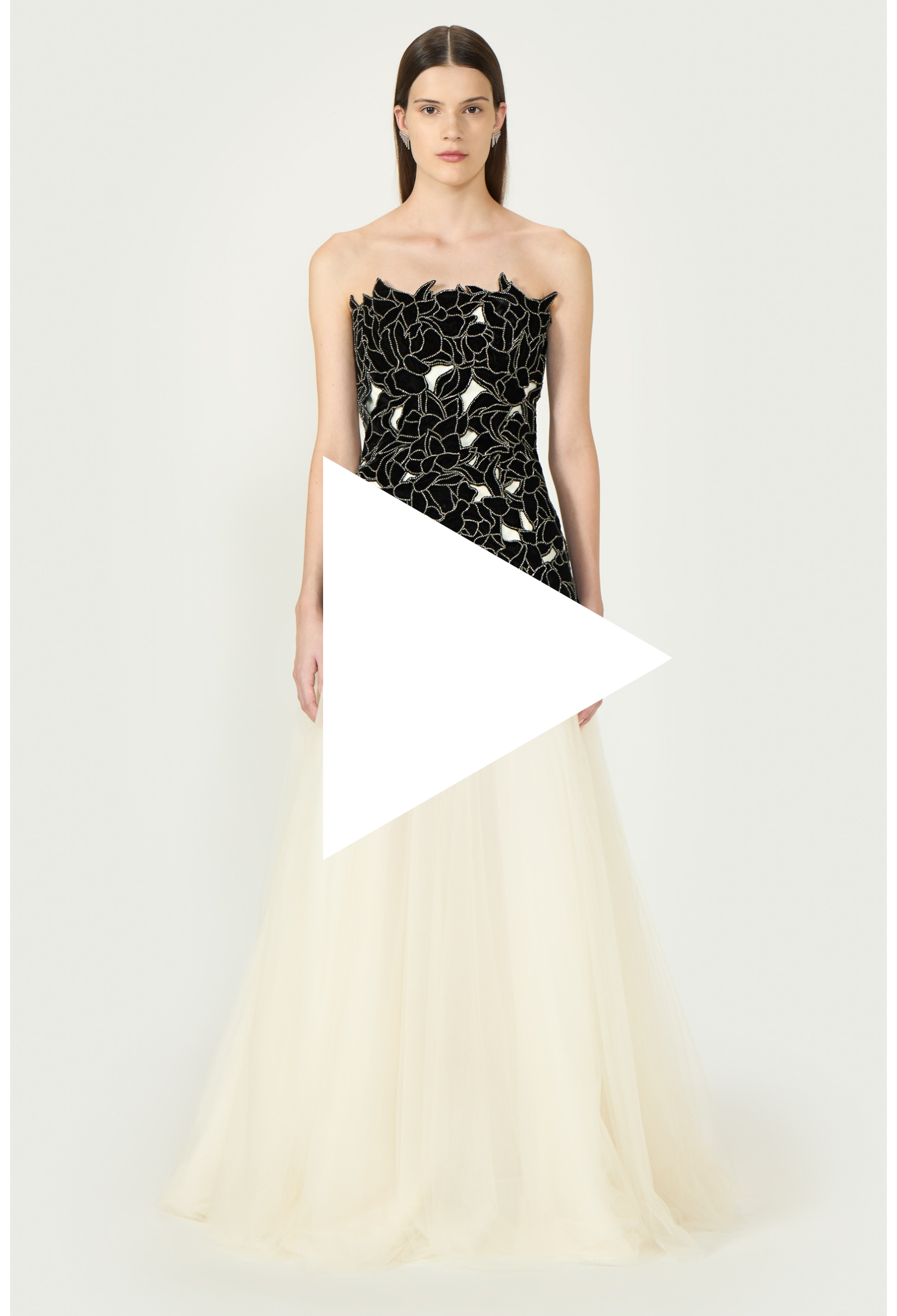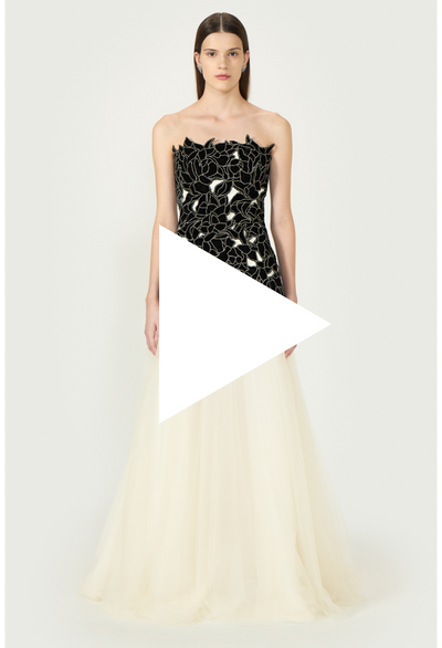 Featuring an airy tulle skirt and delicately adorned with intricate floral-cut velvet on the bodice, the Alessi ball gown is an enchanting piece that exudes timeless appeal.