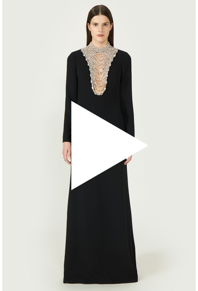 The Dellana gown features long sleeves and a refined straight cut, while cascading rows of meticulously placed crystals create an illusion of layered necklaces, offering a regal yet modern touch.