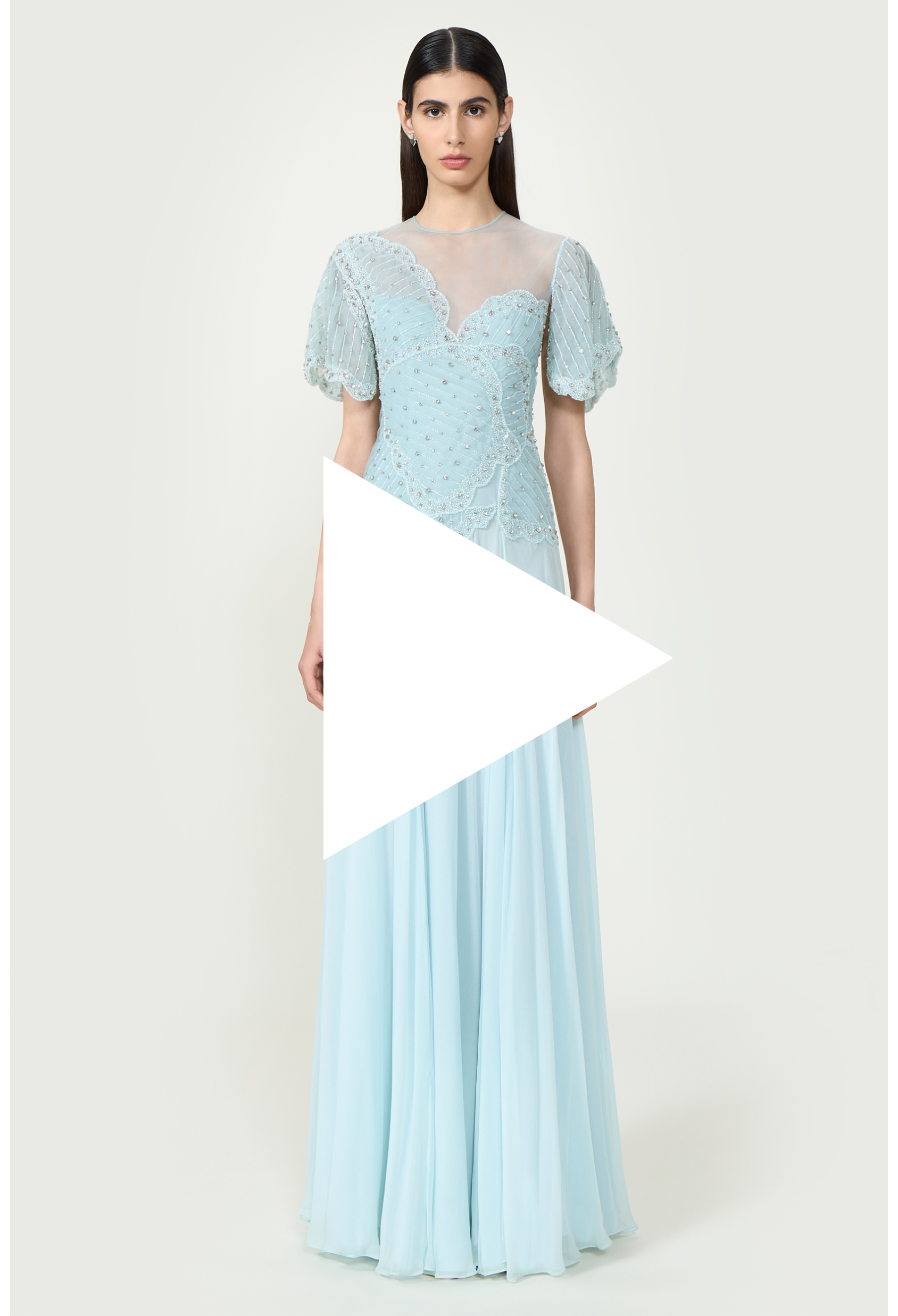 The Elara gown in crystal silk georgette features a delicate illusion yoke and softly flared short sleeves. Intricately adorned with shimmering crystals across the bodice, it captures light and attention with every movement.