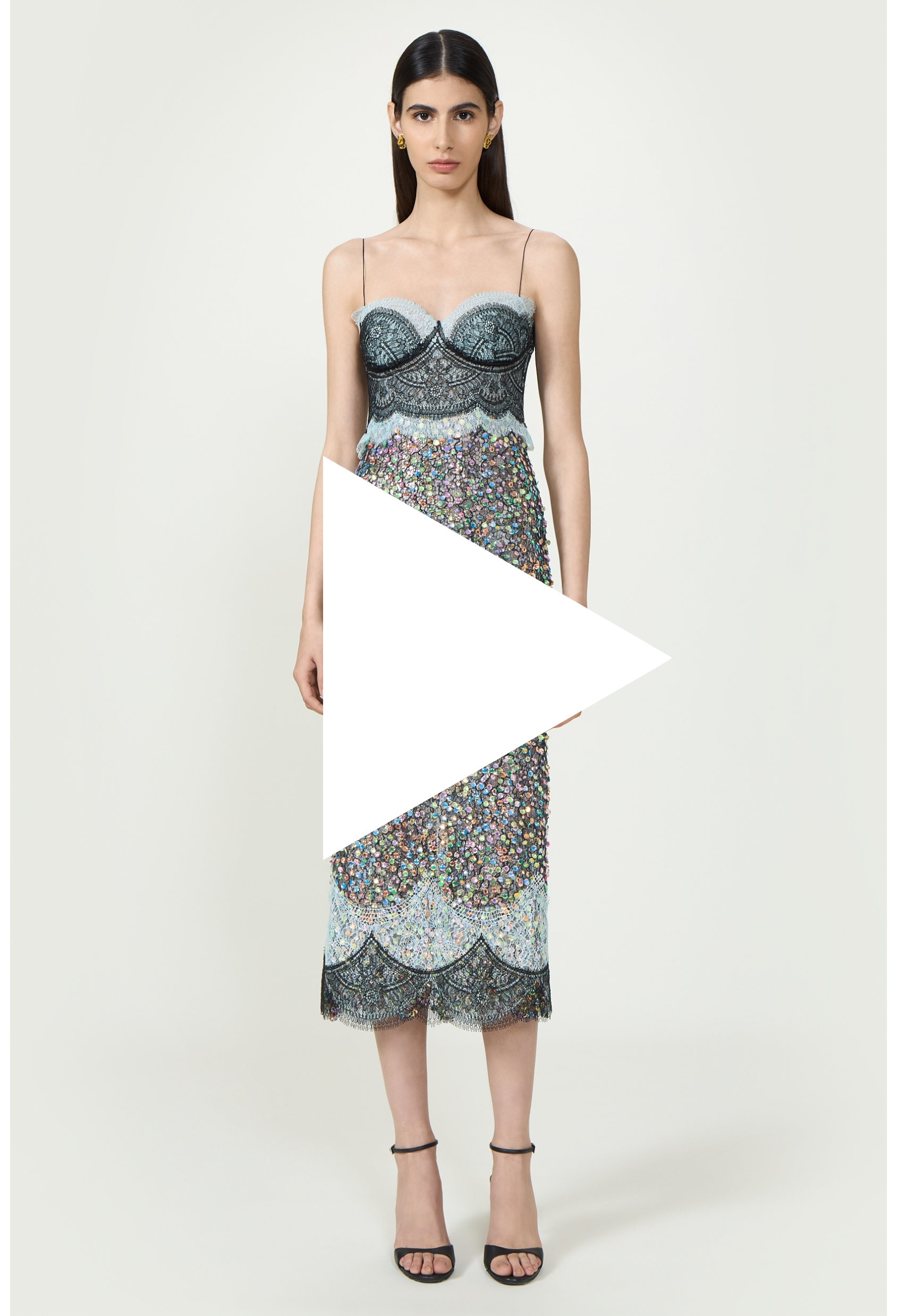 The Lindra midi dress features a romantic sweetheart neckline adorned with Chantilly lace and a sequined skirt that adds a bold shine, making it a must-have piece for your special occasions.