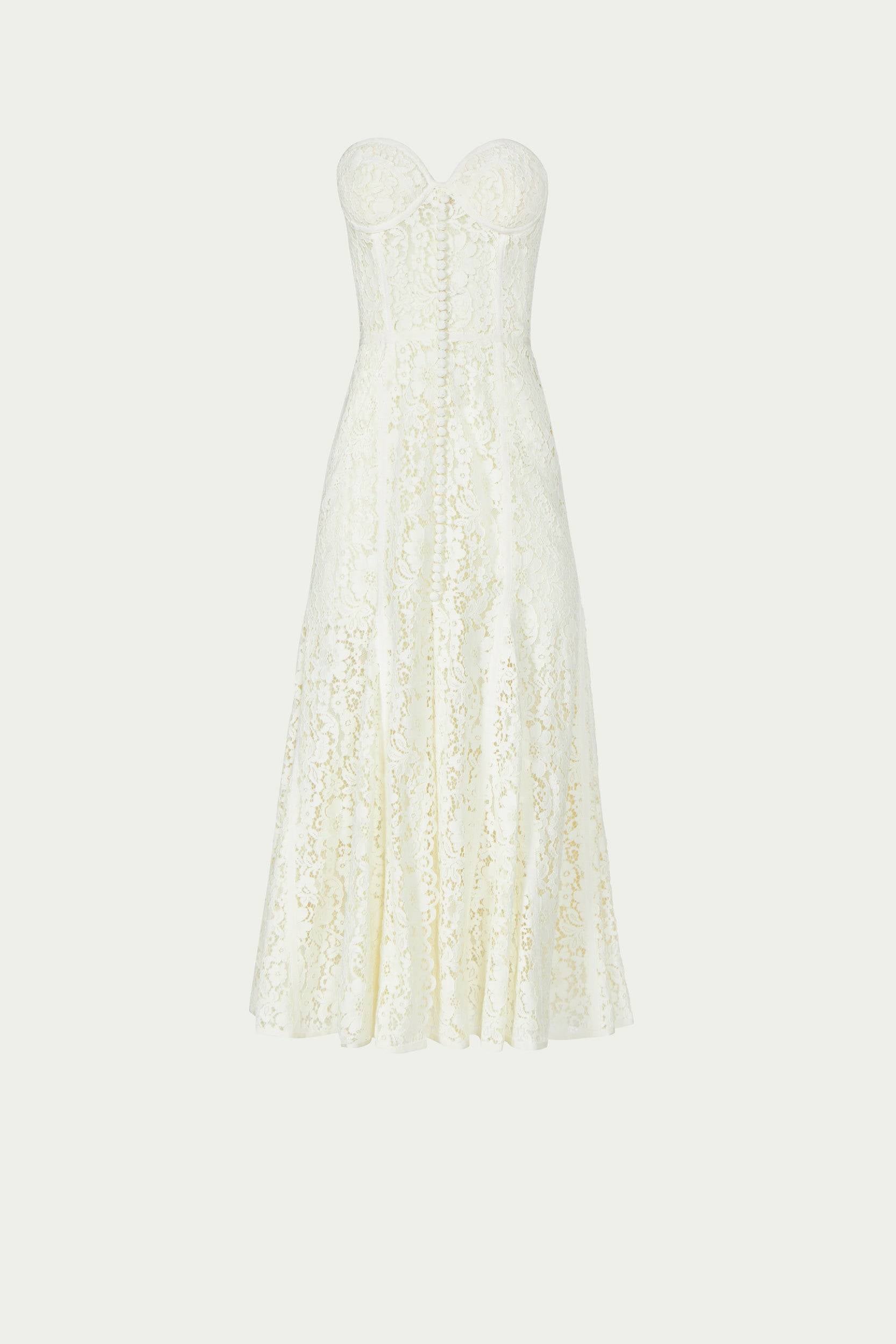 Timeless elegance in every detail, this strapless corded lace bustier dress features delicate texture and sculpting boning for a flawless silhouette.