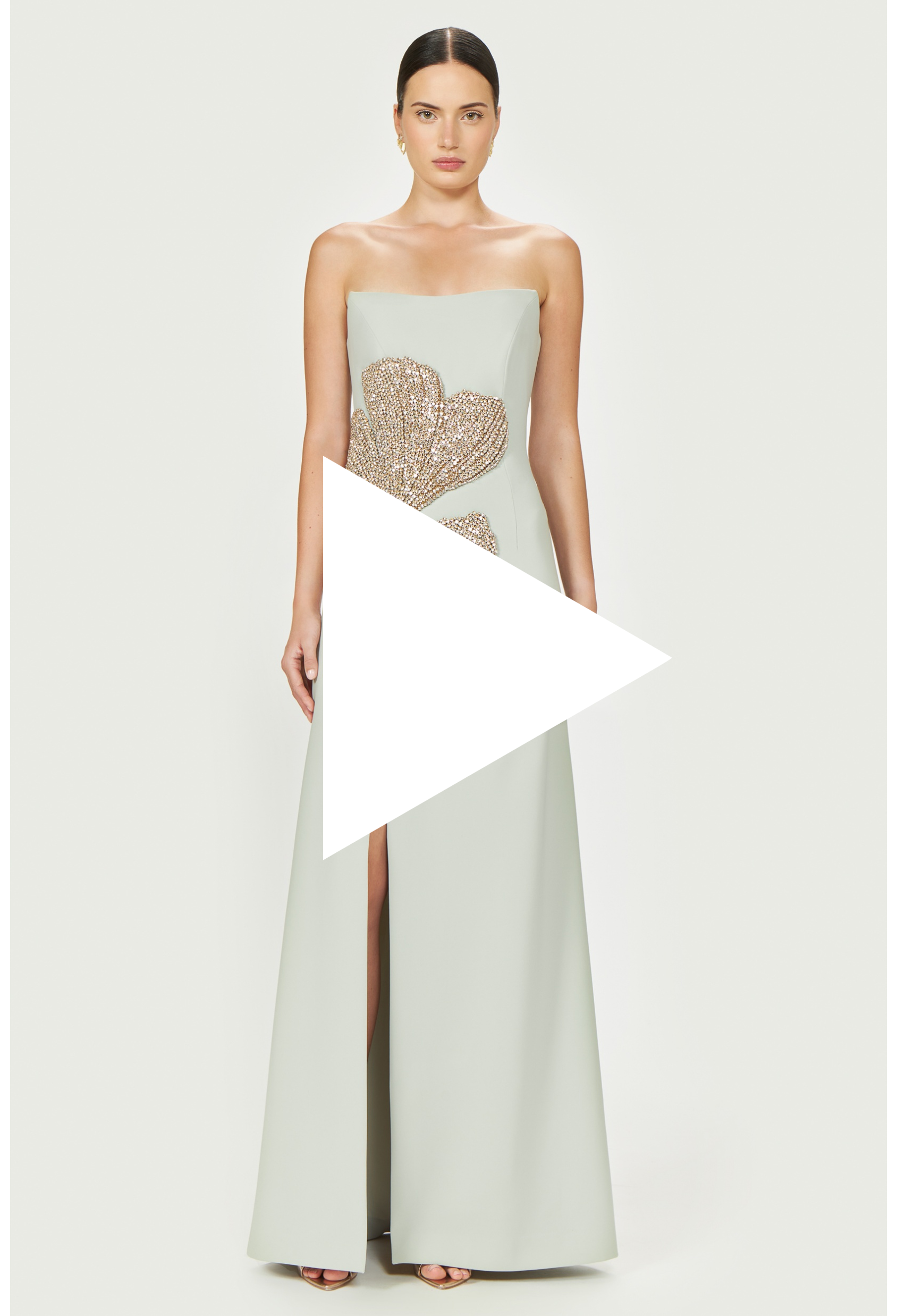 Make a lasting impression in the Faranna crepe strapless gown, detailed with a dazzling crystal appliqué that brings bold, glamorous elegance to any occasion.