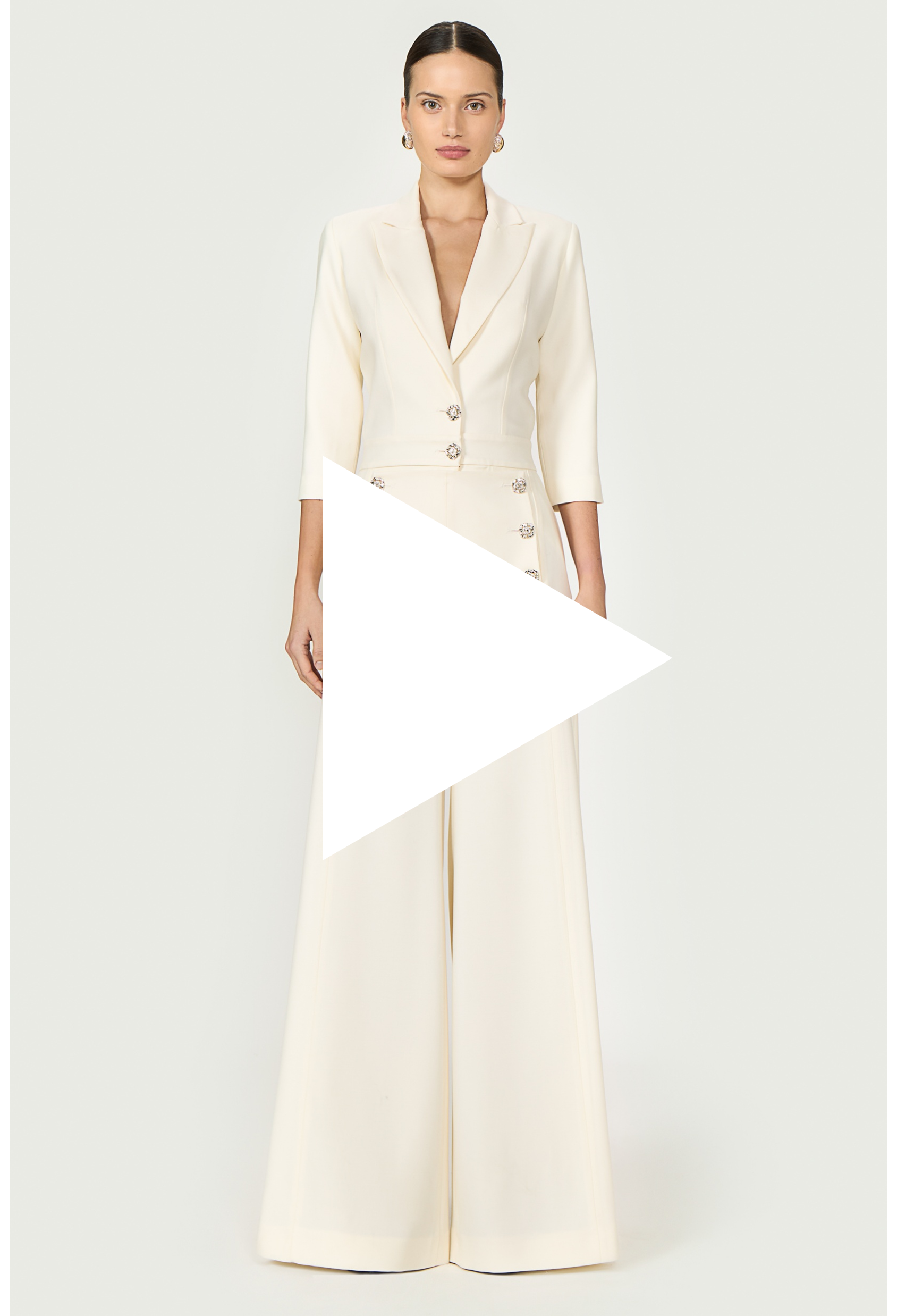Meet the lightweight wool Velara jumpsuit in a tailored silhouette featuring a V neckline and accented by sparkling crystal buttons. A standout piece perfect for any occasion.