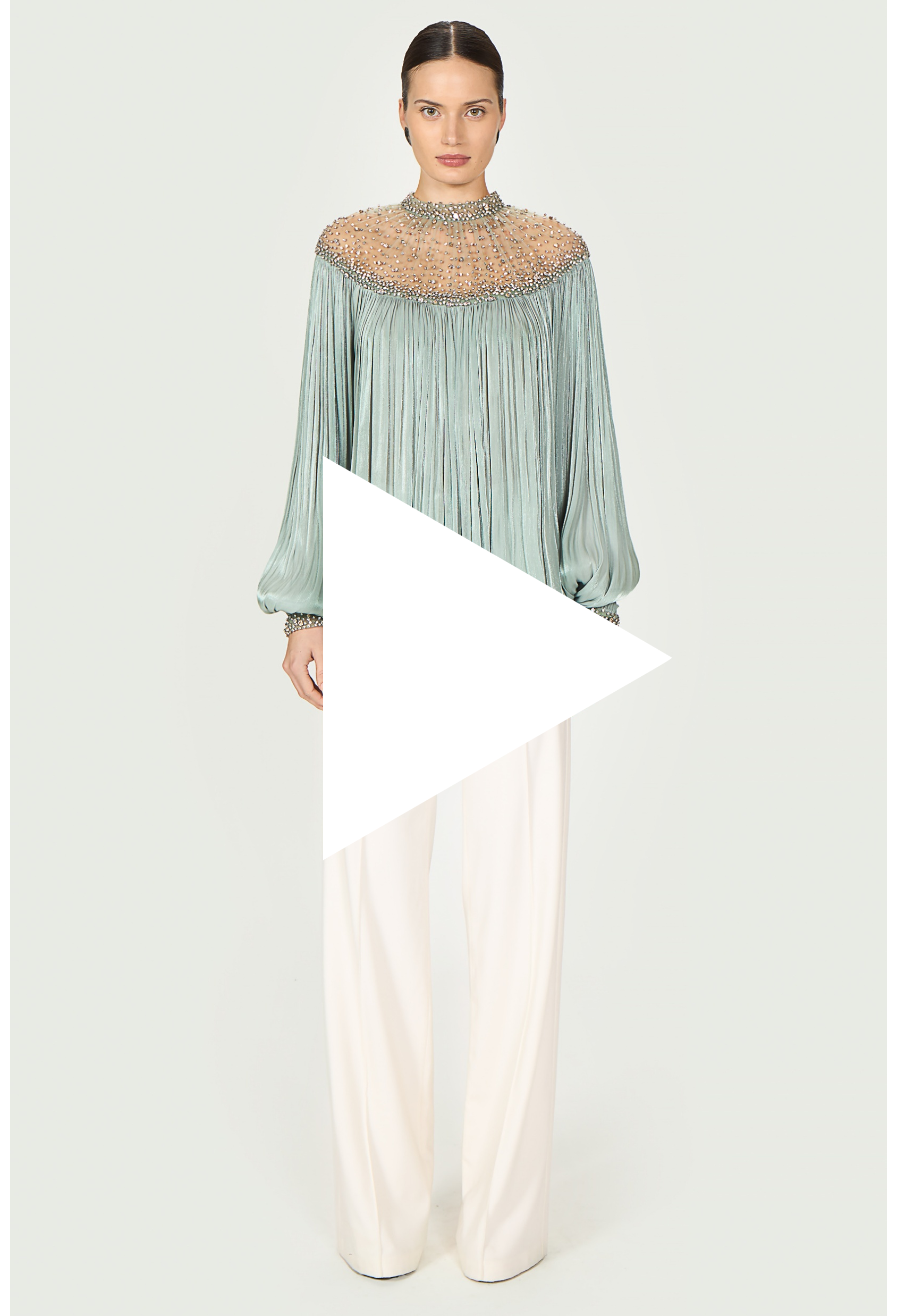 Add a touch of sparkle to your look with the Timea blouse, detailed with glimmering crystal embroidery on the upper bodice. Flowing balloon sleeves complete the look with an elegant, airy charm.