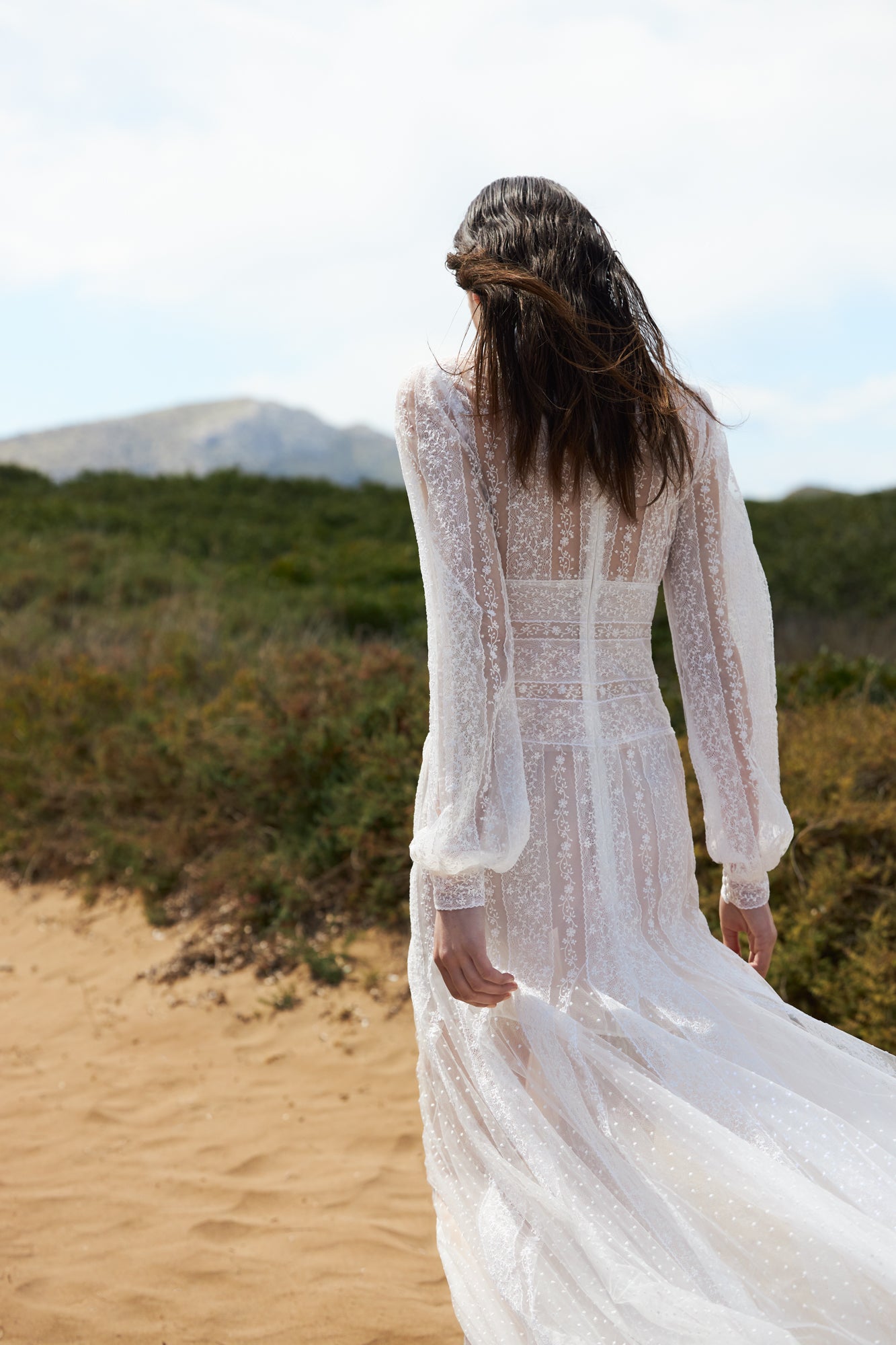 The ethereal designs are informed by Greek traditional elements, such as the elaborate lace patterns found on the Aegean islands, as well as the clean-cut, minimal Ancient Grecian dresses inspired by Ionic architectural rhythm and carved embellishments. The bridal collections showcase the coexistence of tradition and modernity, mirrored in the garments' couture techniques and sensual sheerness.
